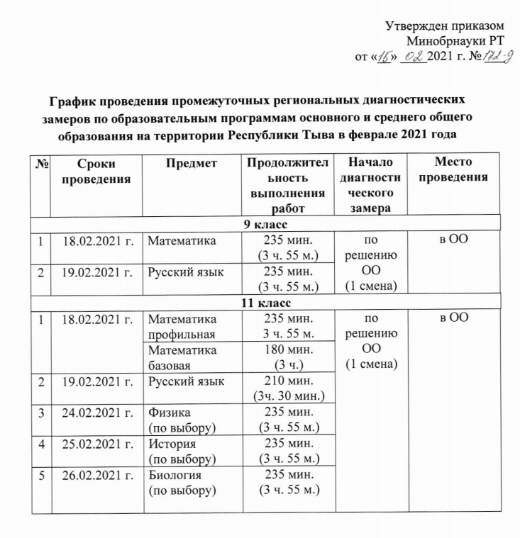 Промежуточные региональные замеры в феврале 2021 г. 17.02.2021 На основании приказа министерства образования и науки Республики Тыва от 15.02.2021г. №172-д «О проведении промежуточных региональных замеров в Республике Тыва в феврале 2021 года», в целях повышения качества образовательных результатов и обеспечения подготовки к успешному прохождению государственной итоговой аттестации по образовательным программам основного общего и среднего общего образования в 2020-2021 уч. году, будут проводить с 18 по 26 февраля 2021г. для 9 и 11 классов в соответствии с графиком: